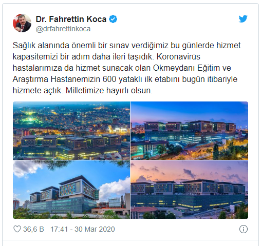 Sağlık Bakanı Fahrettin Koca, yeni tip koronavirüs (Kovid-19) hastalarına da hizmet sunacak Okmeydanı Eğitim ve Araştırma Hastanesinin 600 yataklı ilk etabının bugün hizmete açıldığını bildirdi.