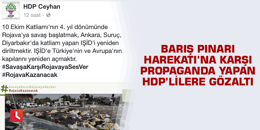 Ceyhan İlçe Emniyet Müdürlüğü ekipleri, PKK/KCK-PYD/YPG silahlı terör örgütünün faaliyetlerinin deşifre edilerek engellenmesine yönelik olarak yapılan çalışmalar kapsamında, Barış Pınarı Harekatına karşı, Ceyhan HDP ilçe Teşkilatının kullanımındaki Facebook hesabından PKK/KCK-PYD/YPG silahlı terör örgütü propagandası, halkı kin ve düşmanlığa tahrik veya aşağılama içerikli paylaşım yapıldığı tespit etti. Şüpheliler şafak vakti yapılan operasyonla gözaltına alındı. Gözaltına alınan şüphelilerin HDP Ceyhan İlçe Eş Başkanları olan Seyfettin Aydemir, Delal Mamuk ve eski HDP ilçe eş başkanı olan Tahir Özdemir olduğu tespit edildi.