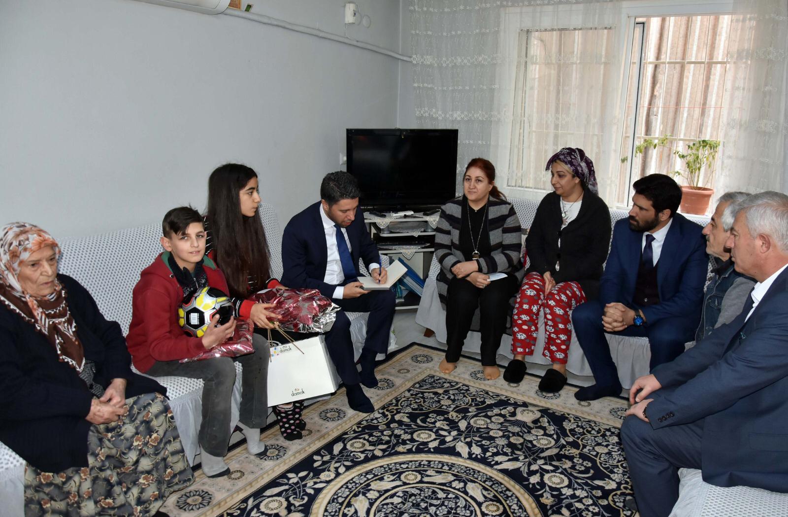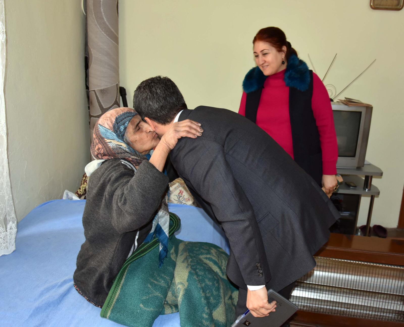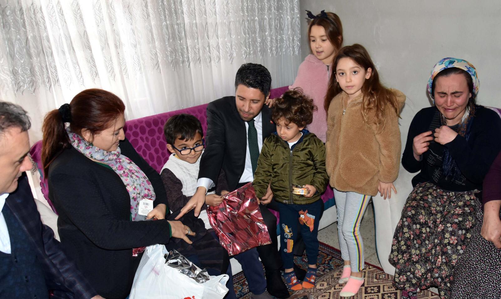 Başkan Ay, Belediye Evleri Mahallesi'nde eşinden ayrı bir çocuğuyla birlikte oturan Şirin Oğlakçı'yı ziyaret ederken başkan yardımcısı ve ilçe başkanının yanı sıra kendi çocukları da eşlik etti.