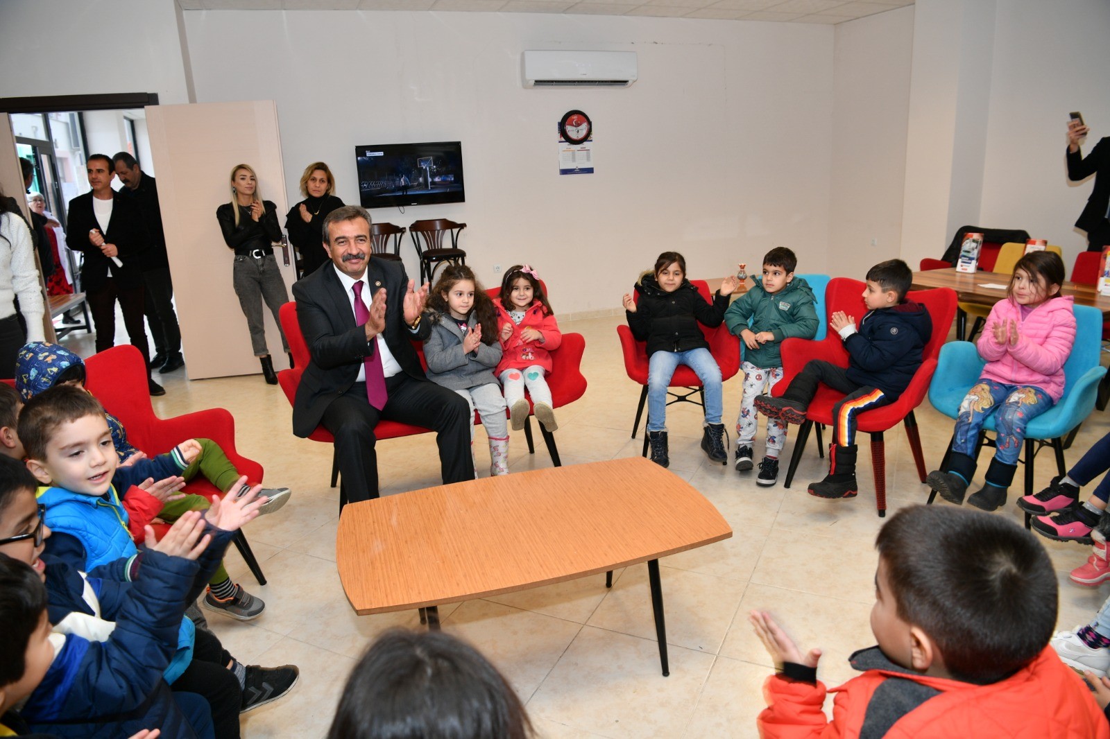 Burada çocuklarla sohbet eden Başkan Soner Çetin, bir ara miniklerle birlikte hep bir ağızdan İzmir Marşı’nı söyledi.