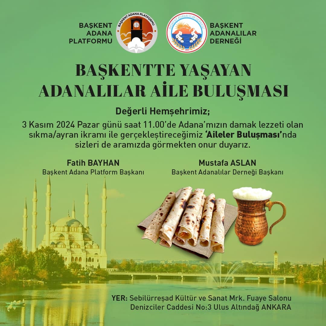 Ankara'da ''Başkentte Yaşayan Adanalılar Aile Buluşması'' gerçekleşiyor. Başkent Adana Platformu Başkanı Fatih Bayhan ile Başkent Adanalılar Derneği Başkanı Mustafa Aslan Başkent Ankara'da bir buluşma organize etti. Ankara'da yaşayan Adanalıları kapsayan program 3 Kasım Pazar Günü saat 11:00'de gerçekleşecek. Aile Buluşması, Sebilürreşad Kültür ve Sanat Merkezi Fuaye Salonu Denizciler Caddesi No: 3'te gerçekleşecek.