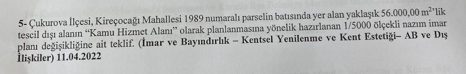 Çukurova Kaymakamlığı'na yakın bir alanda bulunan, imar planında yeşil alan / park alanı olarak ayrılan 56.000 metrekarelik alanın, Adana Valiliği'nce kamu hizmet alanı olarak tahsis talebi Meclis üyelerini ikiye böldü.