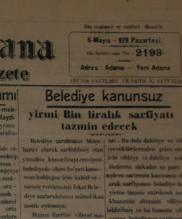 (*) Yeni Adana Gazetesi 06 08 Mayıs 1929 tarih