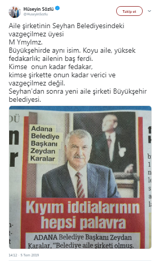 Sözlü'nün "Aile şirketinin Seyhan Belediyesindeki vazgeçilmez üyesi M Ymylmz. Büyükşehirde aynı isim. Koyu aile, yüksek fedakarlık; ailenin baş ferdi. Kimse onun kadar fedakar, kimse şirkette onun kadar verici ve vazgeçilmez değil. Seyhan'dan sonra yeni aile şirketi Büyükşehir belediyesi." twitine Adana Büyükşehir Belediyesi Basın Bürosu'ndan açıklama geldi.