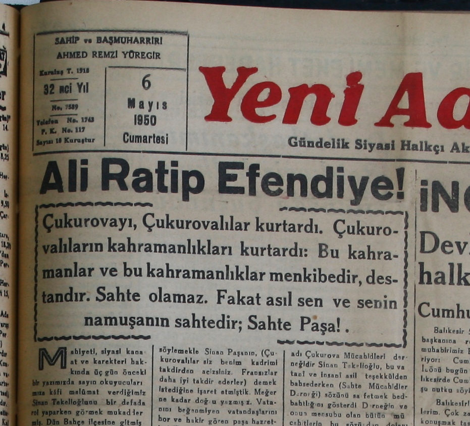 “Çukurova’yı Çukurovalılar kurtardı. Çukurovalıların kahramanlıkları kurtardı. Bu kahramanlar ve bu kahramanlıklar menkıbedir, destandır. Sahte olamaz. Fakat asıl sen ve senin namusun sahtedir; Sahte paşa!” (*)