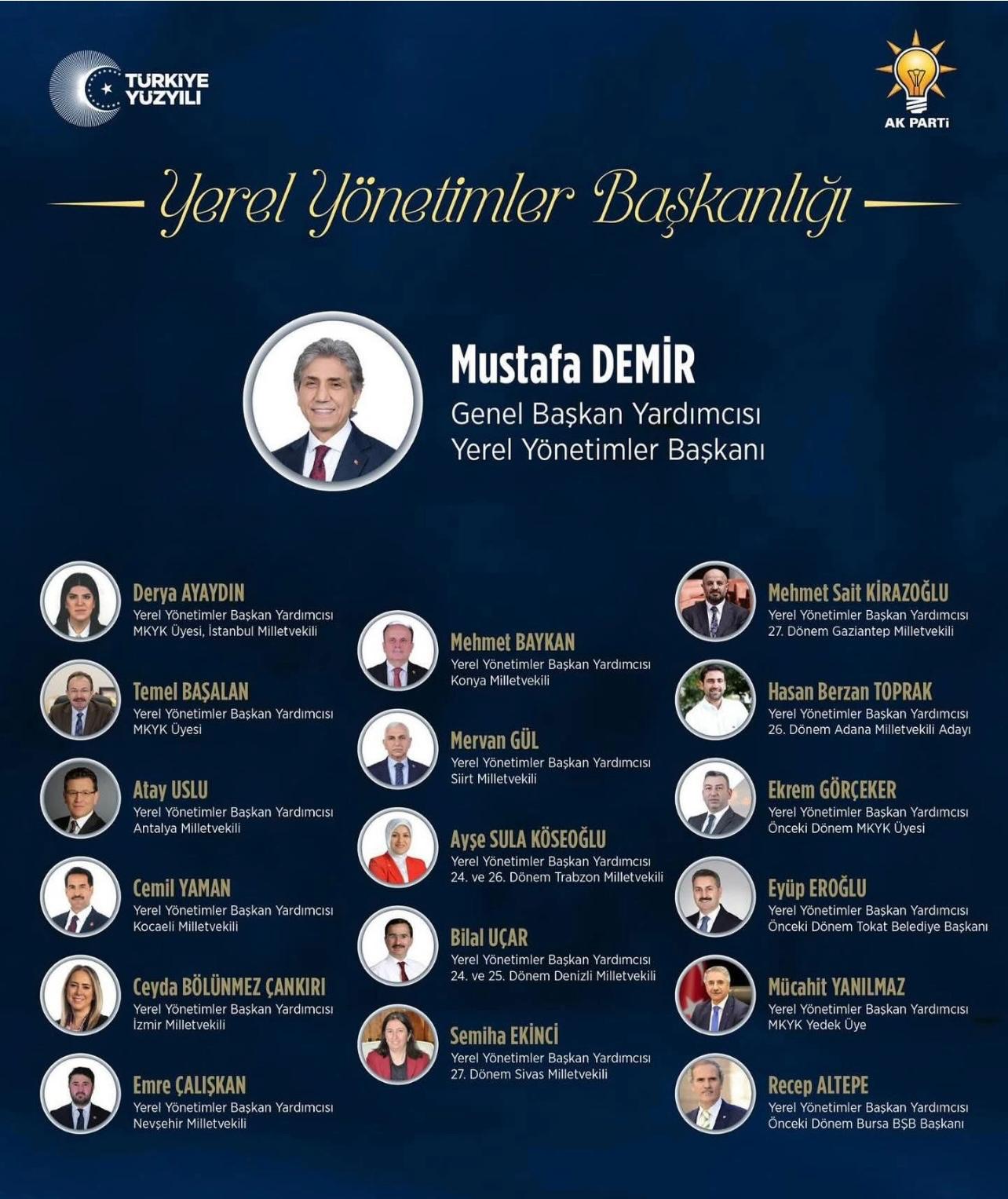 Ak Parti'nin 8. Olağan Kongresi sonucunda Genel Başkan Recep Tayyip Erdoğan, A Takımını belirlemişti. Yerel yönetimlerden sorumlu Genel Başkan Yardımcısı olarak Mustafa Demir'i atadı. Demir'in, yeni yardımcıları içerisinde Adana'dan Hasan Berzan Toprak yer aldı.