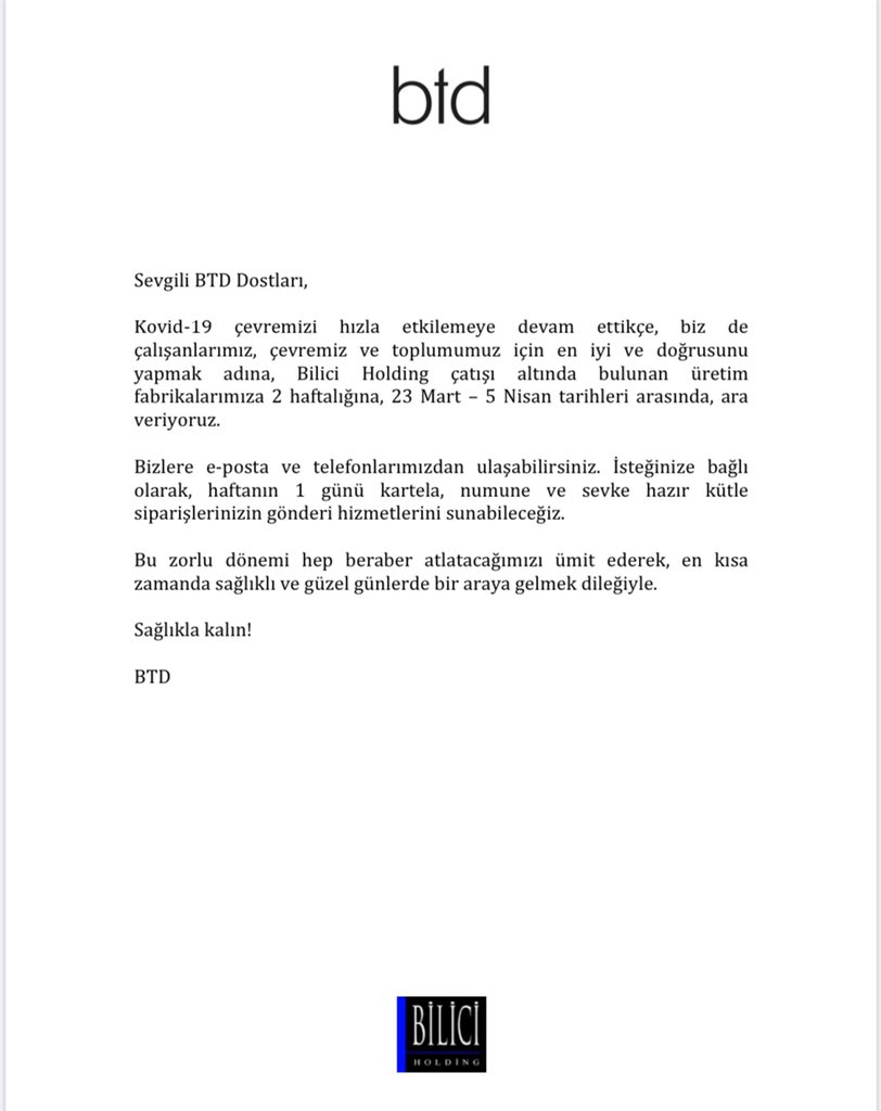 Holding'den yapılan açıklamada, "Bilici Holding olarak çalışanlarımız, çevremiz ve toplumumuzun sağlığı bizim için en önemli konu. #COVID19 ’a karşı Bilici Holding bünyesindeki üretimlerimize 2 hafta ara veriyoruz. Sağlıklı güzel günlerde görüşmek üzere!" denildi.