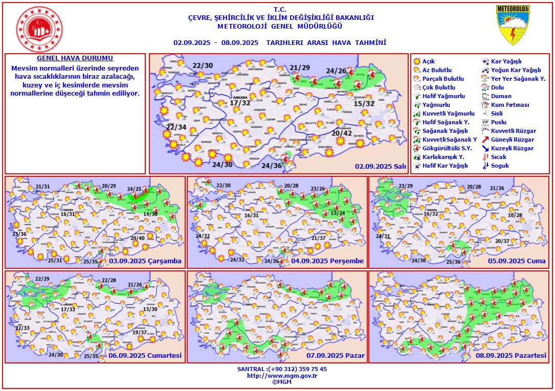 Meteoroloji Genel Müdürlüğü’nün 2-8 Eylül 2025 haftalık hava tahminine göre, Adana’da sıcaklıklar mevsim normallerine yaklaşırken yağışlı günler geliyor.