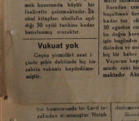 "Geçen yirmi dört saat içinde şehir dahilinde hiçbir zabıta vukuatı kaydedilmemiştir. "