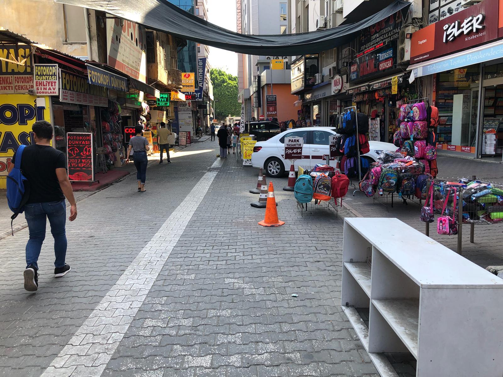 Halk arasında 'Teknosa Sokağı' olarak bilinen Çınarlı Mahallesi 61006 Sokak, kaliteli ve ucuz okul ürünlerinin en bol bulunduğu yer. Ancak bazı esnaflar kaldırım işgalini abartmış durumda. Kucuksaat.com haber merkezine gelen fotoğraflarda, kaldırımla başlayan işgalin, yolun bir şeridine kadar indiği görülüyor.