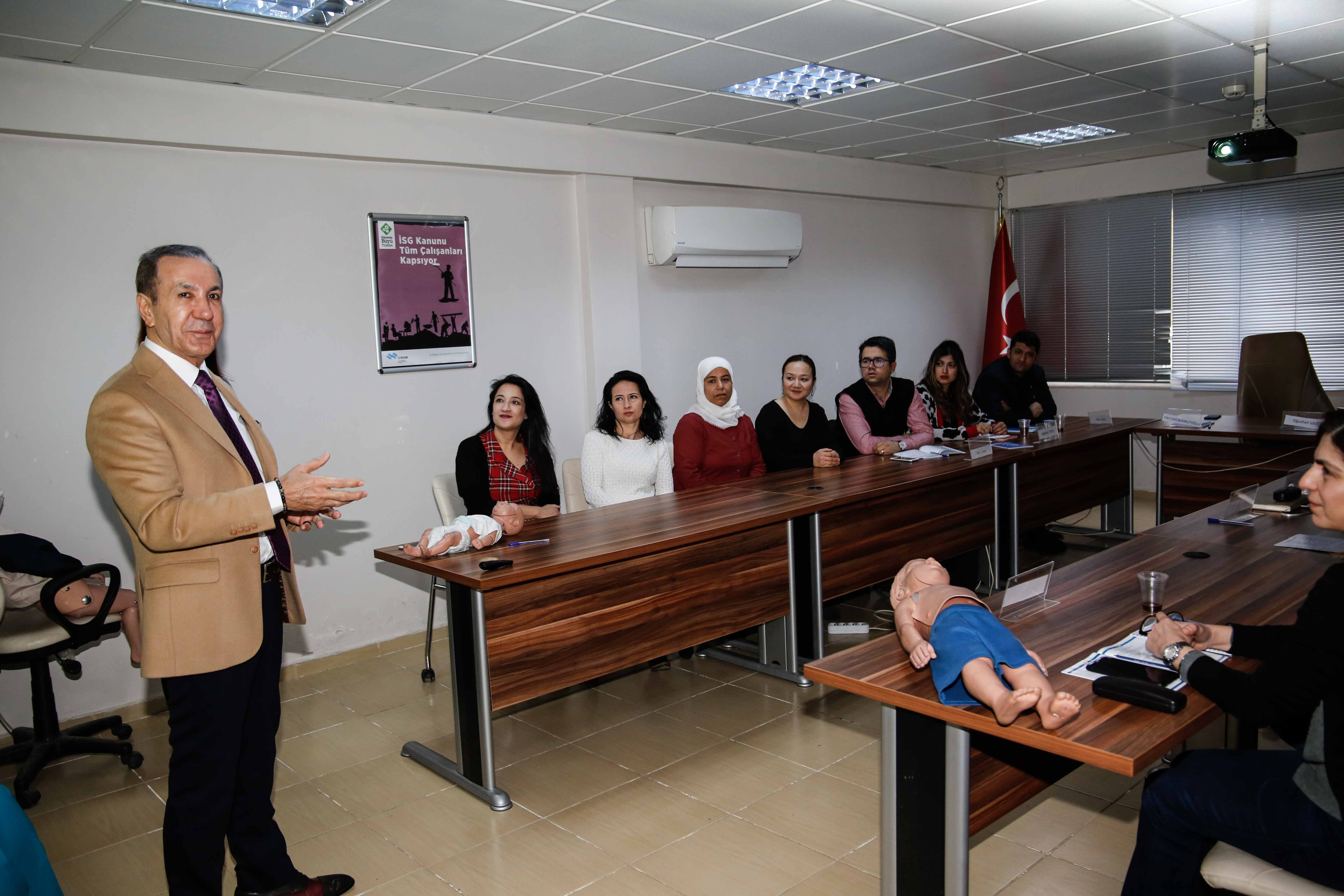 İlk yardım eğitimi kapsamında personele; iş kazası, ev kazası, deprem, trafik kazası ve hastalık gibi hayati tehlike oluşturacak durumlarda nasıl davranmaları ve hangi müdahaleleri yapmaları konularında bilgi aktarıldı.