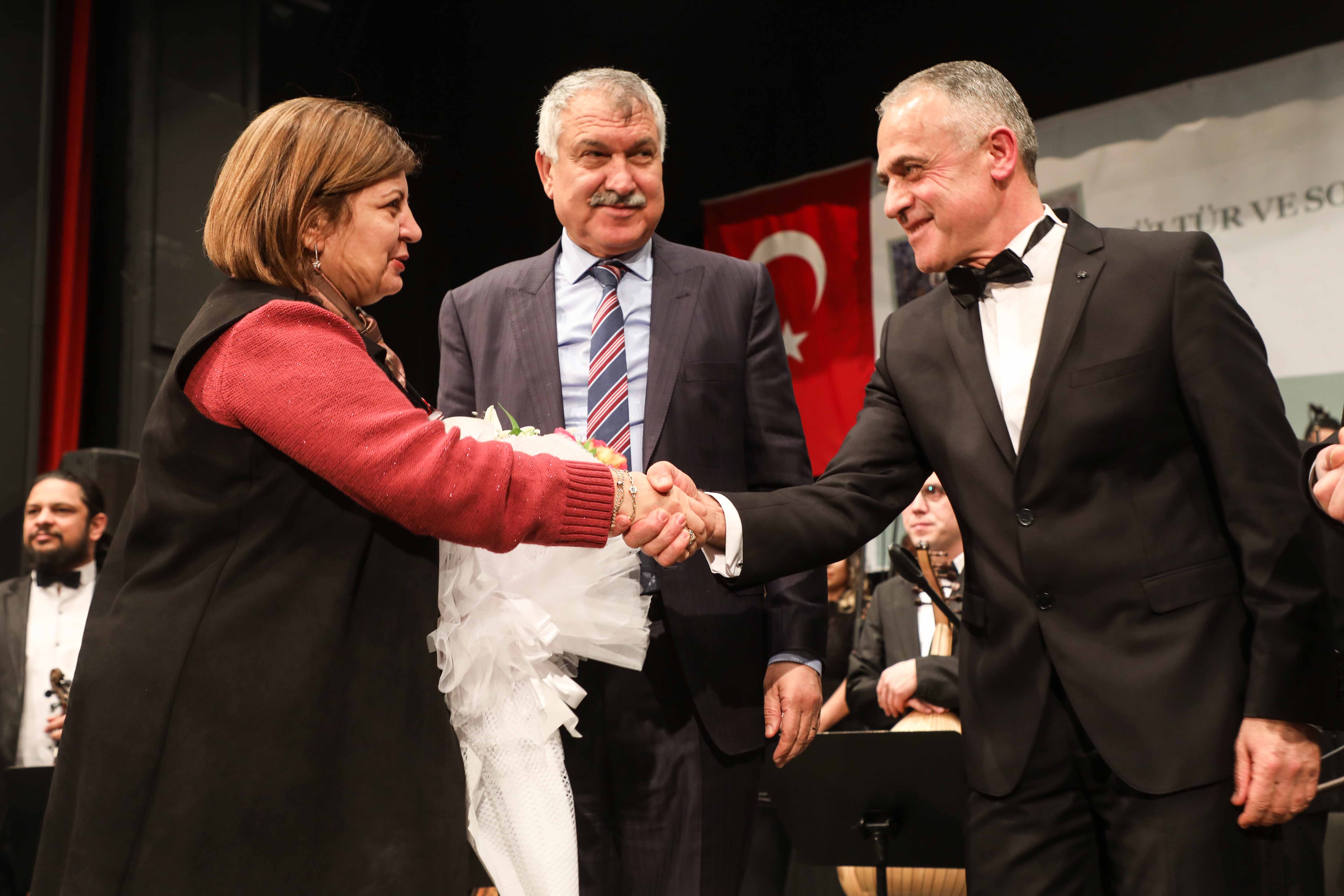 Konser sonrası Başkan Zeydan Karalar ve eşi Nuray Karalar, Şef Cömertbay ve koroya çiçek takdim etti.