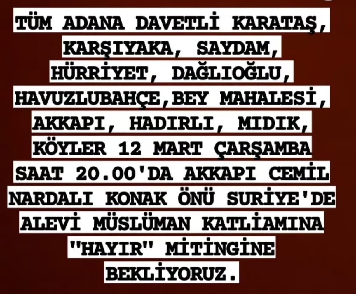 Suriye'de Alevi-Müslüman katliamları devam ederken tepkilerde çığ gibi büyüyor. Adana'da bazı Sivil Toplum Kuruluşları, Suriye'de yaşanan Alevi-Müslüman katliamı için tepkilerini göstermek adına protesto gösterisi düzenleyecek. Çarşamba günü saat 20:00'da başlayacak olan miting, Akkapı Cemil Nardalı Konak önünde gerçekleşecek.