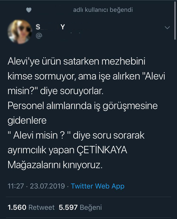 Bir twitter kullanıcısı paylaşımında "Alevi'ye ürün satarken kimse mezhebini sormuyor ama işe alırken Alevi misin? diye soruyorlar. Personel alımlarında iş görüşmesine gidenlere 'Alevi misin?' diye sorarak ayrımcılık yapan Çetinkaya Mağazaları'nı kınıyoruz." sözleriyle Çetinkaya'nın işe alım mülakatlarında mezhepçilik yaptığını iddia etti.