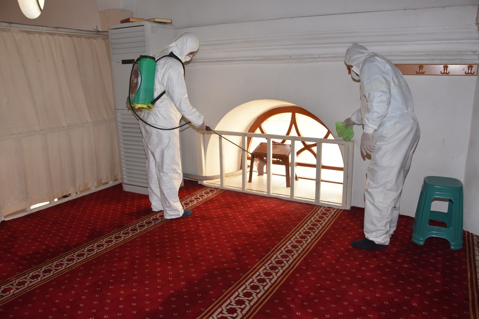 Belediye ekipleri, yürütülen ilaçlama çalışmaları kapsamında, özel kıyafetler giyip, maske takarak dezenfekte işlemi yaptı.