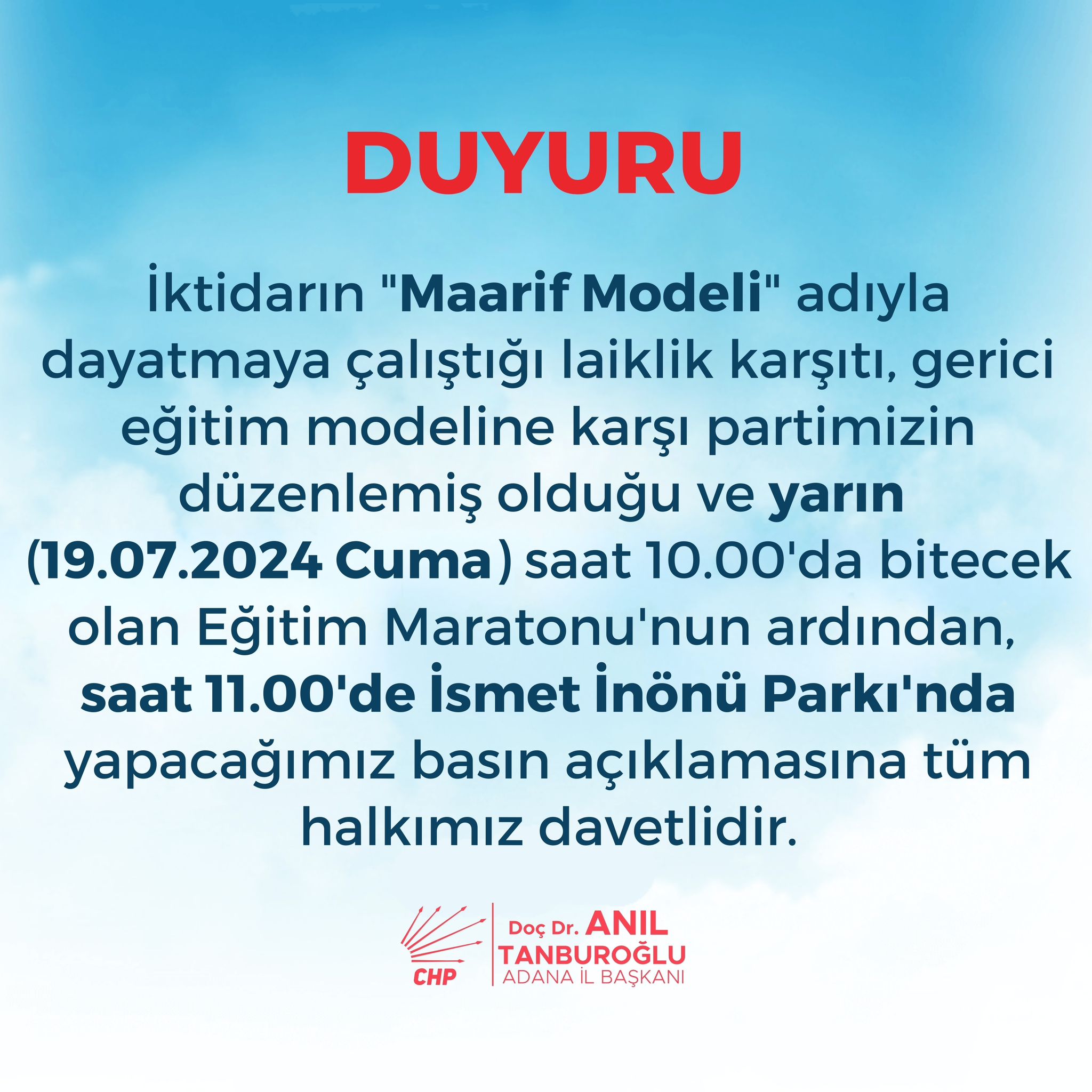 CHP Adana İl Başkanı Anıl Tanburoğlu, eğitim modeline karşı bir basın açıklaması yapacağını duyurdu. Duyuruda, iktidarın gerici bir eğitim sistemi sunduğunu dile getirdi. Açıklama da şu sözlere yer verildi;