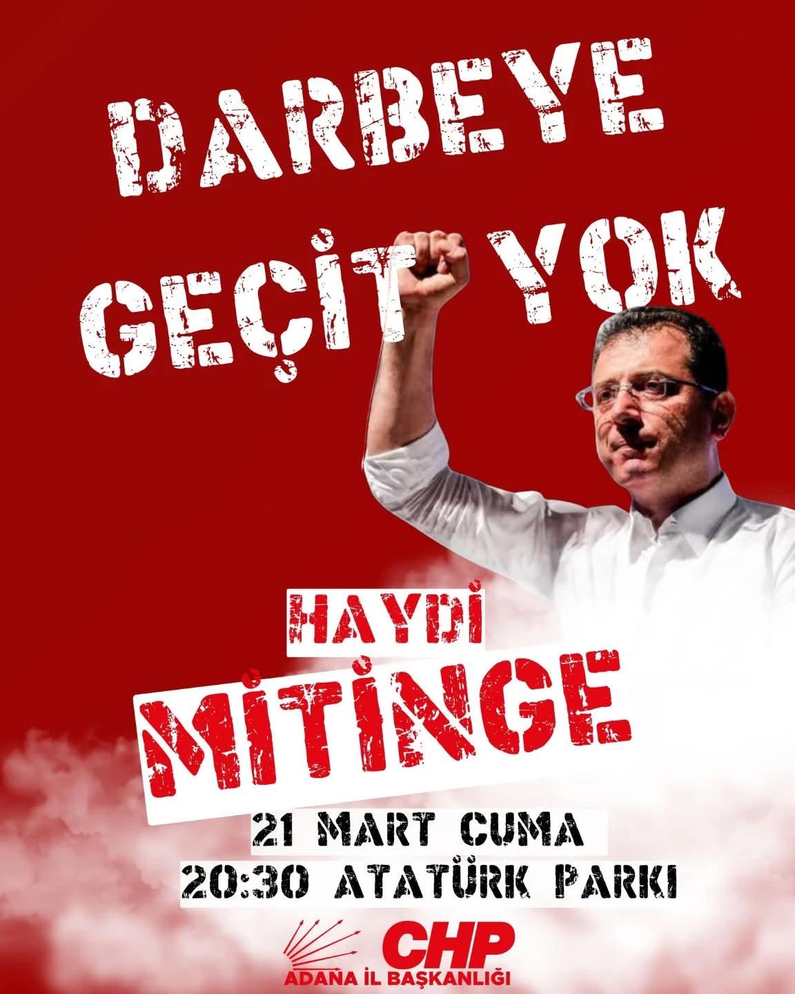CHP Adana il Başkanlığı, bugün saat 20:30'da miting yapılacağını duyurdu.