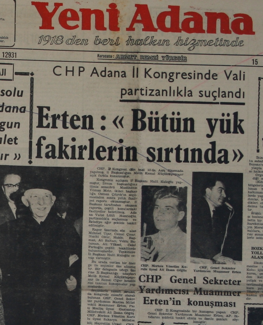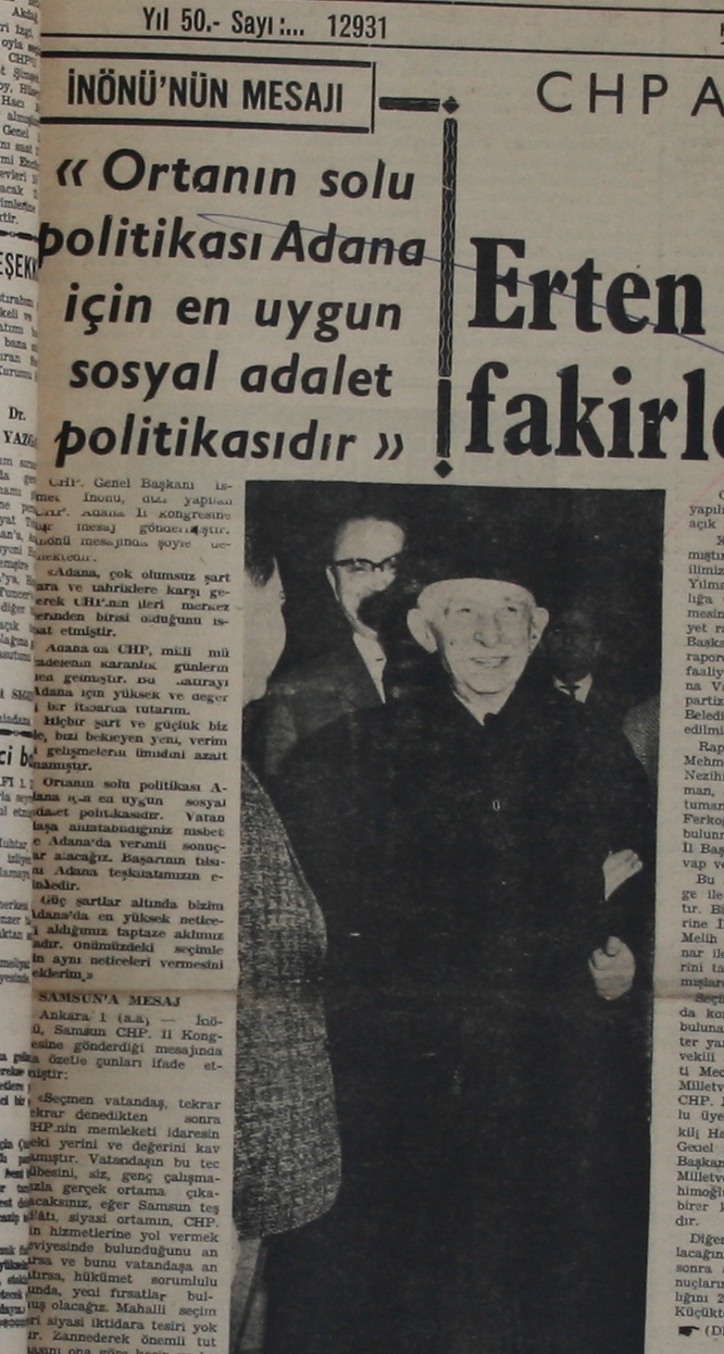 1968 yılının ocak ayında Adana'da il kongresi yapılacaktır. O zamanın iktidarı Adalet Partisi (AP) ve Başbakan -Merhum- Süleyman Demirel'dir. O günün CHP Genel Başkanı -Merhum - İsmet İnönü: "Ortanın Solu Politikası Adana için en Uygun Sosyal Adalet politikasıdır. (...) Adana çok olumsuz şartlara ve tahriklere karşı gelerek CHP'nin ileri merkez neferinden birisi olduğunu ispat etmiştir" dedi. (Bu cümle bugün için de tamı tamına geçerli)