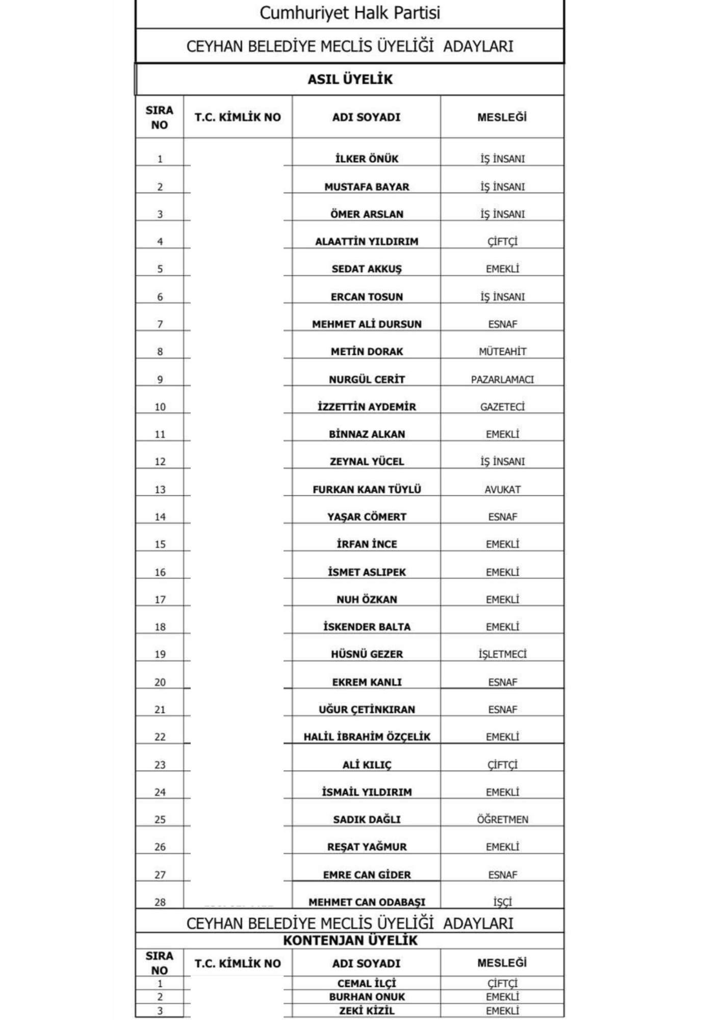CHP Ceyhan Meclis Üyesi Adayları Tam ListesiCHP, Ceyhan Belediye Meclis Üyeliği için YSK'ya listeyi bildirdi.A+A-