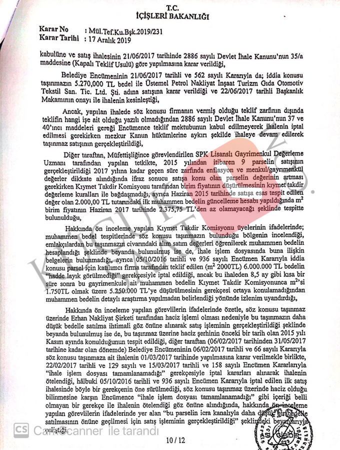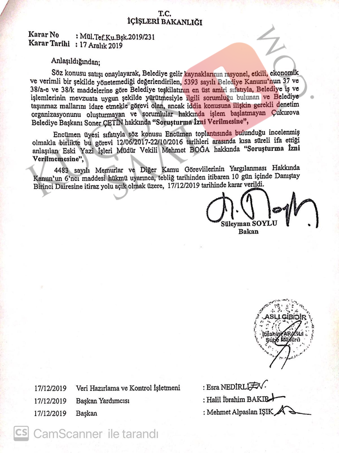 Yapılan tespitler neticesinde başkan Soner Çetin, bu satışta imzası bulunan meclis üyesi ve bürokratlar hakkında İçişleri Bakanı Süleyman Soylu soruşturma izni veriyor.