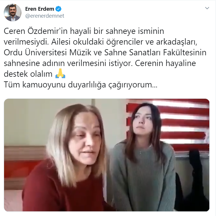 CHP'li Eren Erdem konu ile ilgili olarak "Az önce Adana Çukurova Belediye Başkanımız Sayın Soner Çetin aradı ve Çukurova Bülent Ecevit parkında yer alan müzik ve sanat atölyesine sevgili Ceren Özdemir’in adını vereceklerini duyurdu. Adını ve sana yapılanları unutturmayacağız Ceren. Teşekkürler başkan." dedi.