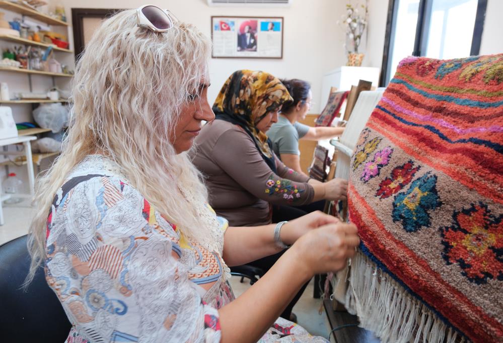 Atölyelerinin 8 yıldır kadınlara hizmet verdiğini ve birçok kurs verdiklerini belirten Çukurova Belediyesi Atatürk Kadın Yaşam Köyü Yetkilisi Ayşe Atay, "Kurslarımızdan bir tanesi de kilim ve halı dokuma. Ama biz burada sadece kilim ve halı dokumuyoruz. Çanta dokuyoruz, yelek yapıyoruz. Kilimlerimizde daha çok eskiye yönelik desenleri tercih ediyoruz. Depremden sonra da burası iyice canlandı. Çünkü depremde insanlar çok fazla etkilendiler. Evde kalmak istemeyen hanımlar da burayı daha çok tercih etmeye başladılar" dedi.