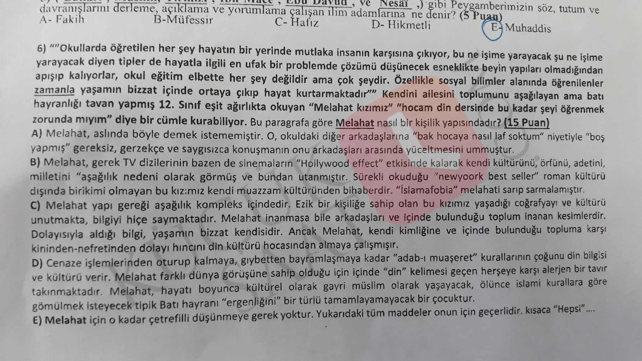 Melahat'in kişilik yapısının din kültürü ve ahlak bilgisi öğretmeni üzerinden yazılı sınavda öğrencilere dayatılan, sonrasında ise bir öğrencinin cevap anahtarı kağıdının fotoğrafını çekmesi ile tartışılmaya açılan bu soruya kucuksaat.com olarak yorum yapmadan yayınlıyor ve okuyucularımızın takdirine bırakıyoruz.