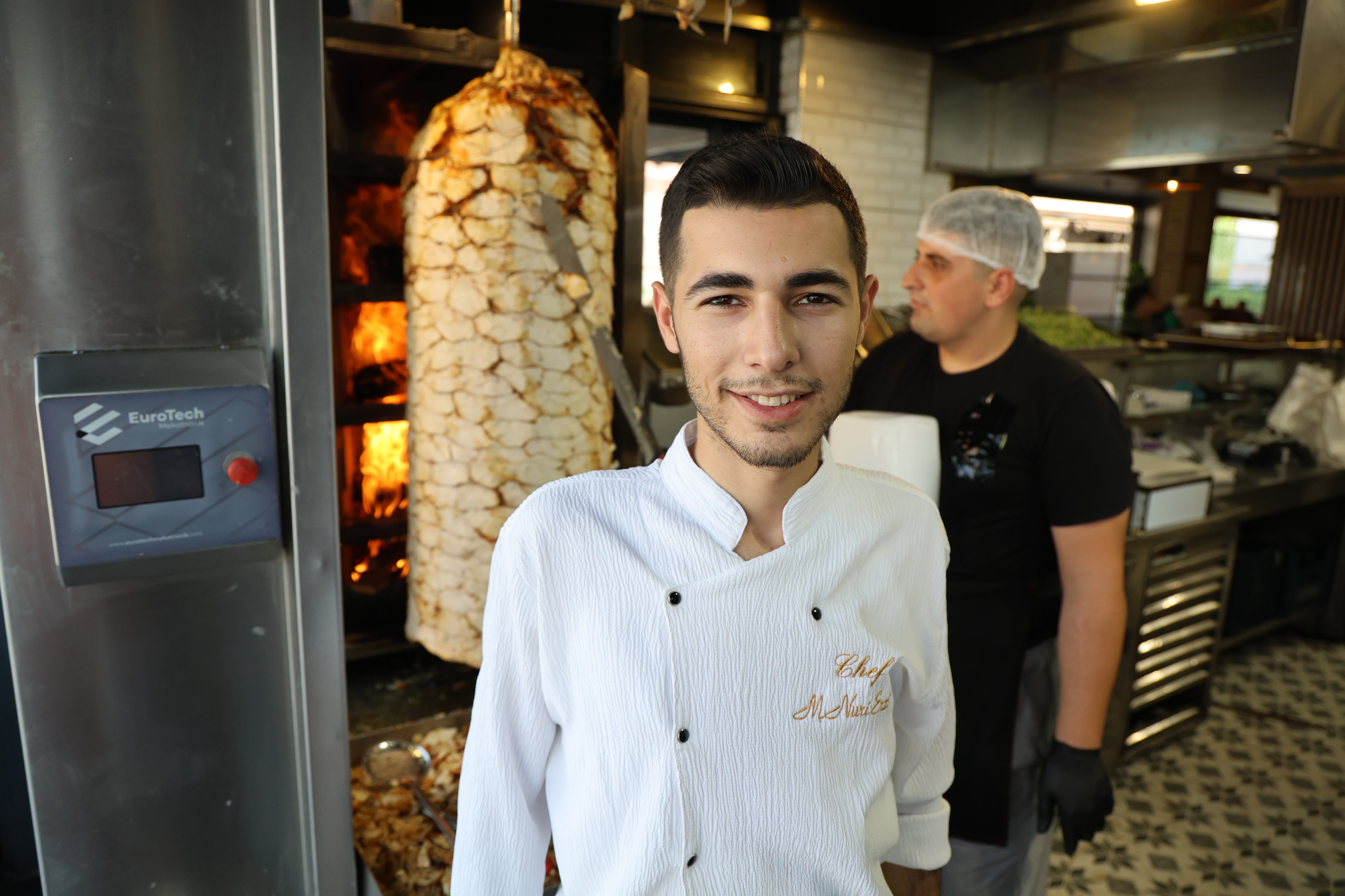 Adana’da hava sıcaklıkları 40 dereceyi aşınca ocak başında çalışan döner ustaları, sırt ve göğüslerine kalıp buz koyarak çalışmaya başladı.