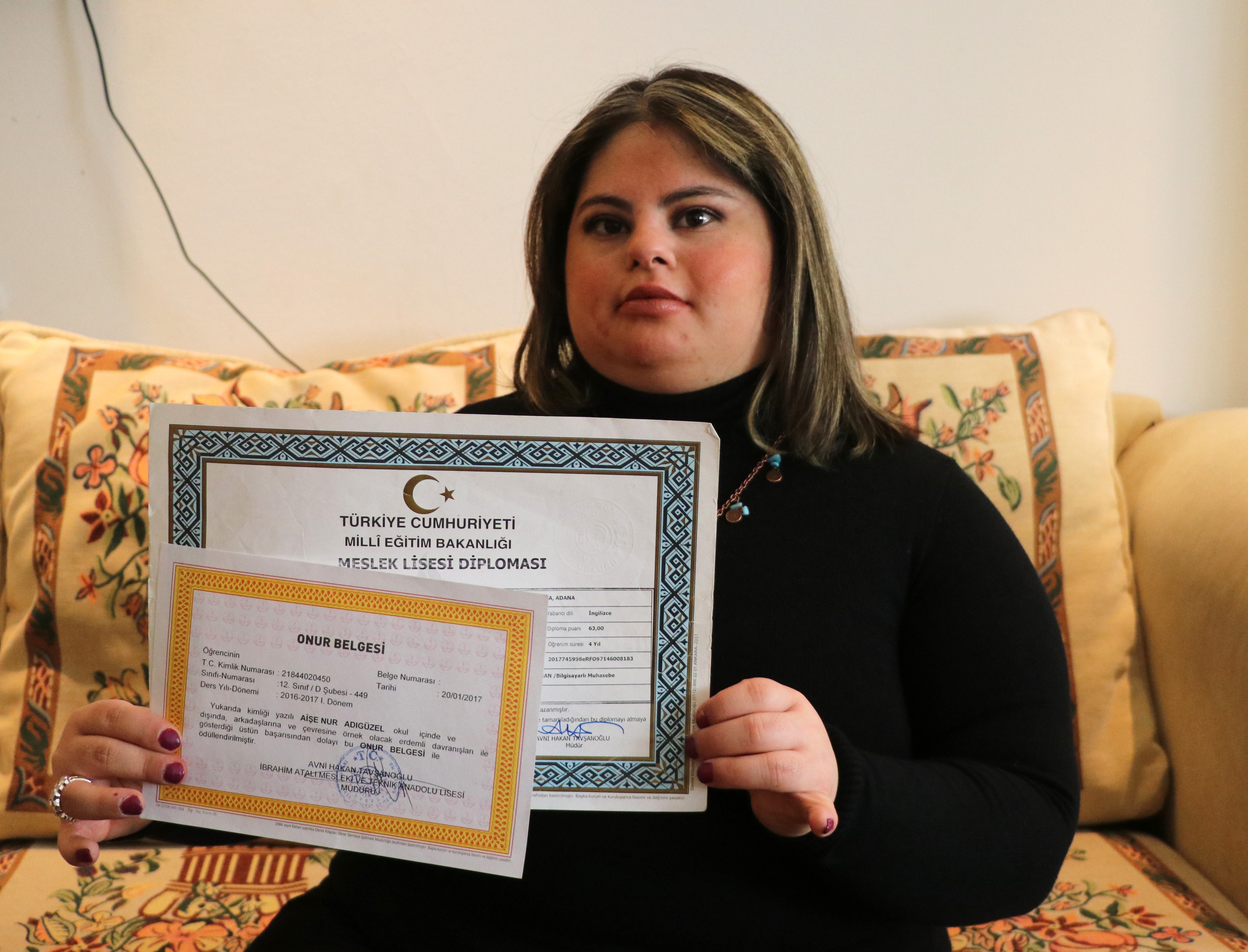 Adana’da down sendromlu Aişe Nur Adıgüzel, doktorların ‘Uğraşmayın’ demesine rağmen annesi Ayfer’in çabasıyla hayata tutunup liseyi bitirdi.