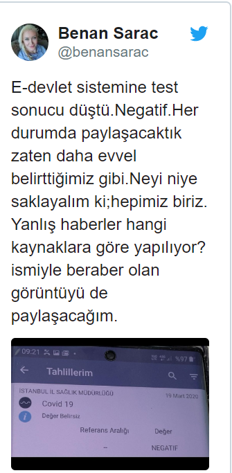 Benan Saraç, eşinin test sonucunu sosyal medya hesabından paylaştı. Benan Saraç, "Beklediğimiz sonuçlara ulaştık.