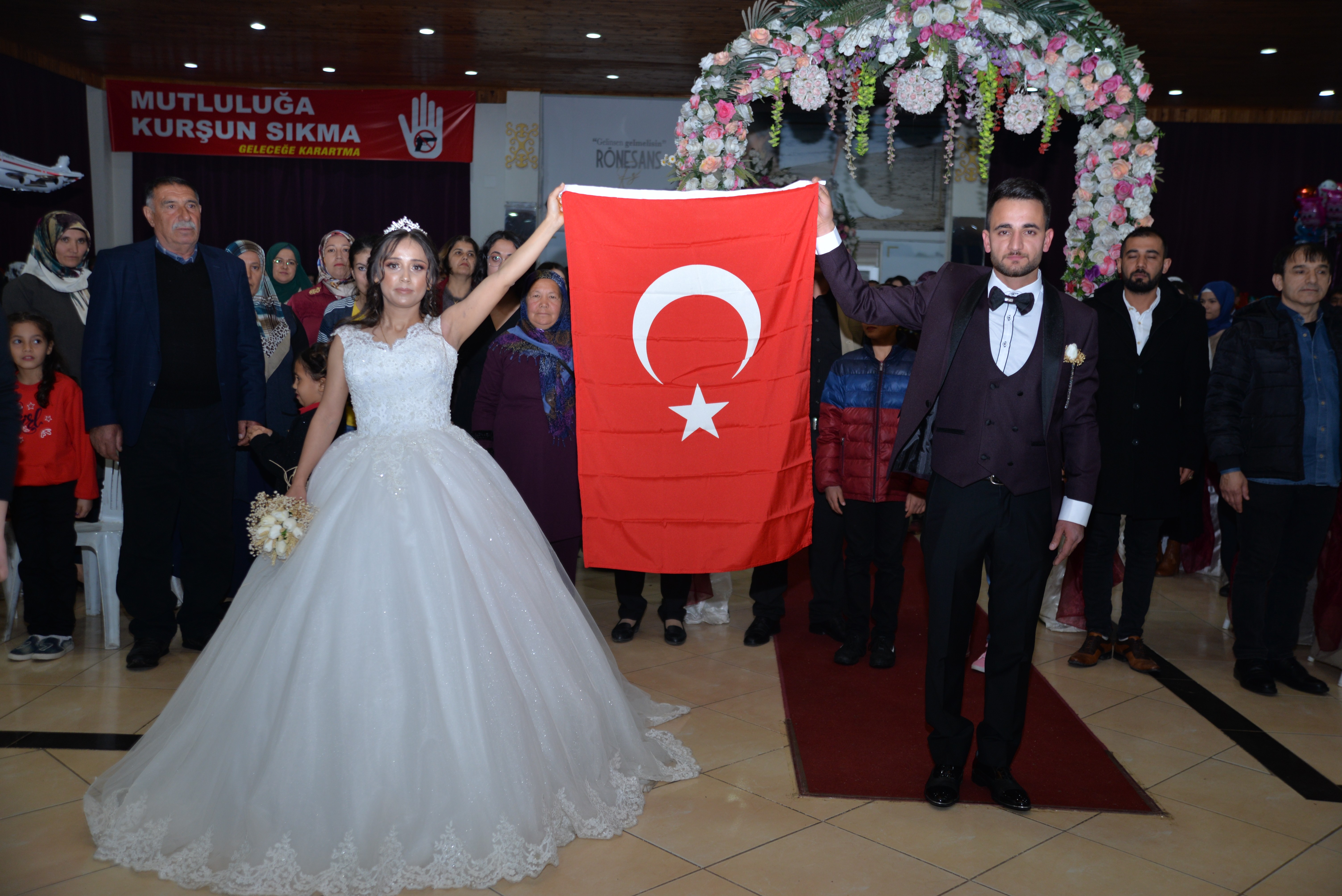 Kent merkezinde bir düğün salonundaki düğün töreninde Samet - Duygu çifti, İdlib’te şehit düşen 34 askeri anmak için salona Türk bayrağı açarak girdi.
