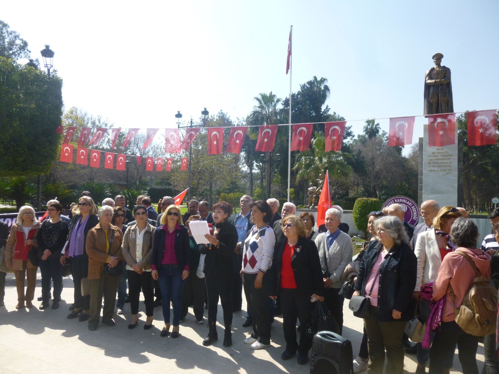 Vatan Partisi Öncü Kadın Adana İl Başkanı Duru Akgül 8 mart Dünya Emekçi Kadınlar günü etkinlikleri çerçevesinde Atatürk Anıtı önünde yaptığı konuşmada: "Şiddet insanı, emeği sömüren, ülkelerin gelişimini engelleyen sistemin getirdiği bir sonuç. Bu sistem içerisinde kadını tek başına kurtarmak söz konusu olamaz. Kadının hayatından yoksulluğu çıkartamadıkça o kadının hayatından şiddeti de çıkartamayız" dedi.