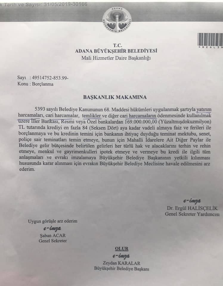 Büyükşehir Bld Başkanı 169 milyon lira borç yetkisi istemiştir. Bakın yetki diyorum çünkü Belediye Meclisi borç vermez; borçlanılabilmesi için başkana yetki verir. İşçi maaşı için istediği miktar 23 milyon liradır ki bunu da sözlü dile getirmiş bu paylaşımda göreceğiniz resmi yazıda olduğu gibi maaş ödemesi için bir borçlanma resmen bulunmamaktadır. Kaldı ki dün bu yetkiyi almış olsa dahi bir bankadan 1 gün içinde bu parayı alması ve bayram öncesi bu parayla ödeme yapması mümkün değildir. Samimiyetsizlik ve yalan siyaseti burada başlamaktadır. Bakınız Adana Büyükşehir Belediyesinin ASKİ dahil aylık geliri 150 milyon civarındadır. Bunun işçi maaşı ASKİ personeli dahil yaklaşık 30 milyondur. Şimdi işçi, emekçi dostu naraları atanlar bu kadar para ile ÖNCELİKLİ İŞÇİ MAAŞLARInı niçin ödemezler. Niçin 2 aylık maaşları bekletirler. Öncelikleri nedir?