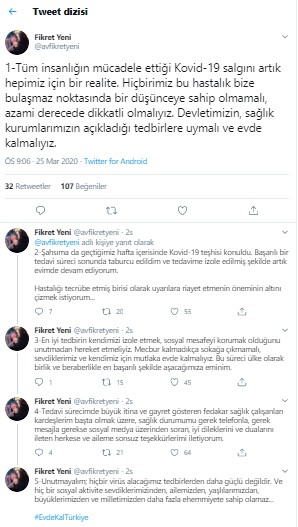 Devletimizin, sağlık kurumlarımızın açıkladığı tedbirlere uymalı ve evde kalmalıyız. Şahsıma da geçtiğimiz hafta içerisinde Kovid-19 teşhisi konuldu.
