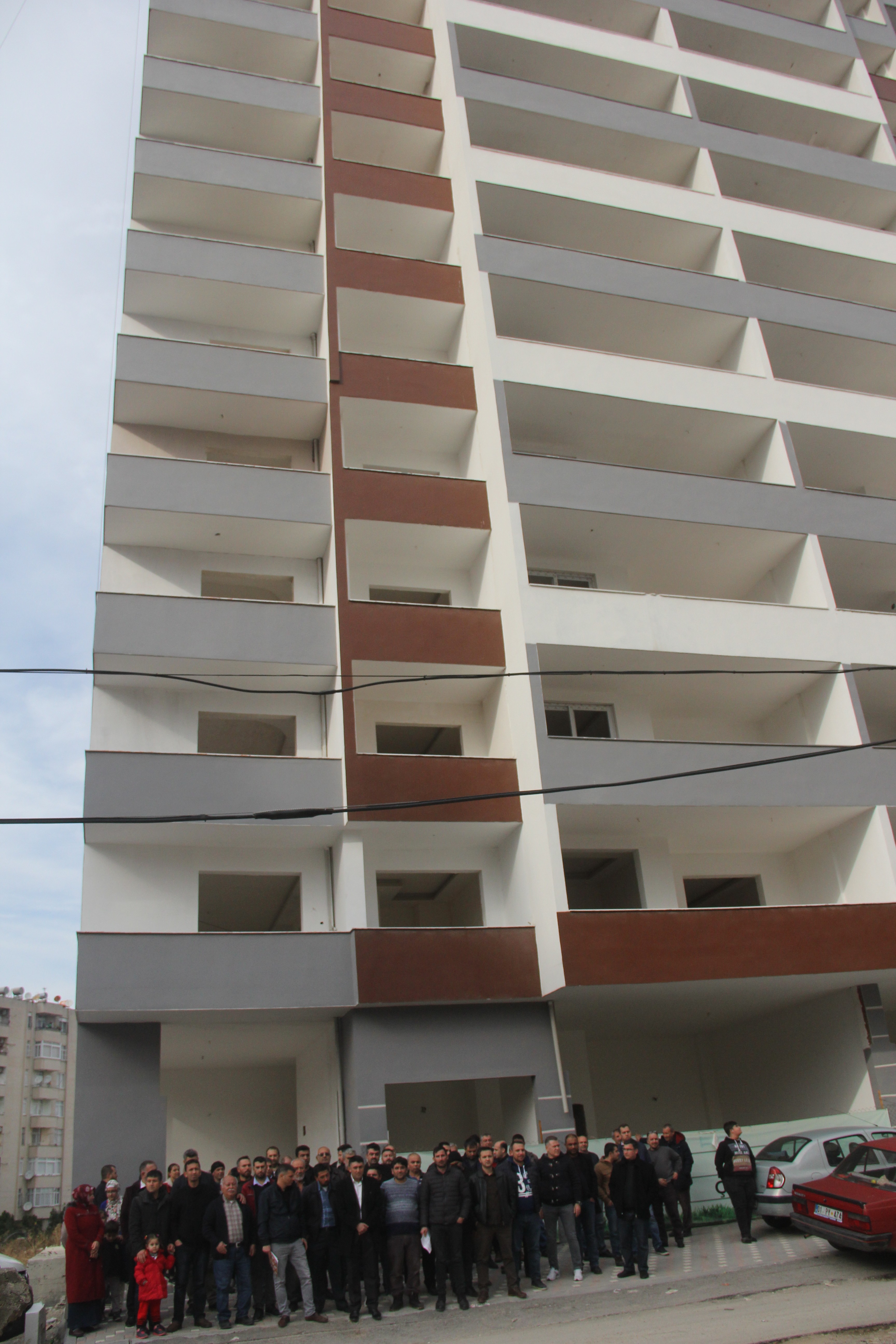 Apartman önünde toplanan sakinler evlerinin paralarını ödemelerine rağmen bir türlü teslim edilmediğini, ayrıca bir dairenin birden fazla kişiye satıldığını ileri sürdü.