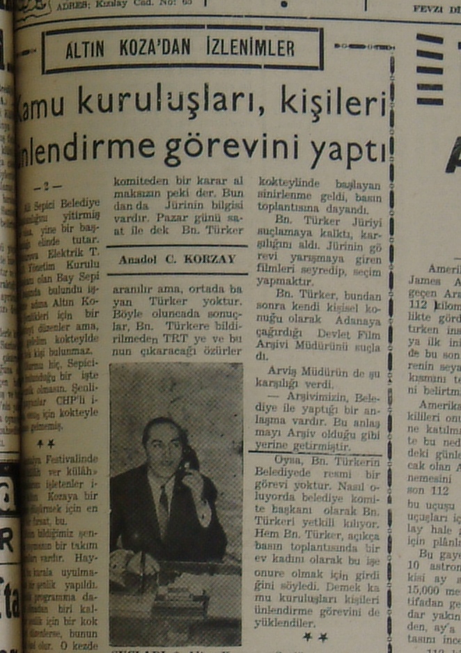 Eğer Adana, bir film yarışmasının sonunu getirebilmiş ise bunun başarısını Devlet Film Arşivi Müdürü ile Jürinin ağırbaşlılığına borçludur. Ama ortada şenlik diye bir şey yoktu., bundan yalnızca düzenleyenler sorumludurlar. Yalnızca film seyretmiş olmakla yetinip; babalarının, annelerinin veya amcalarından kalan paralarla kendilerini sanatsever göstermek isteyenlerin altından kalkacağı bir iş değildir, sanat yarışması yapmak…”(*) .
