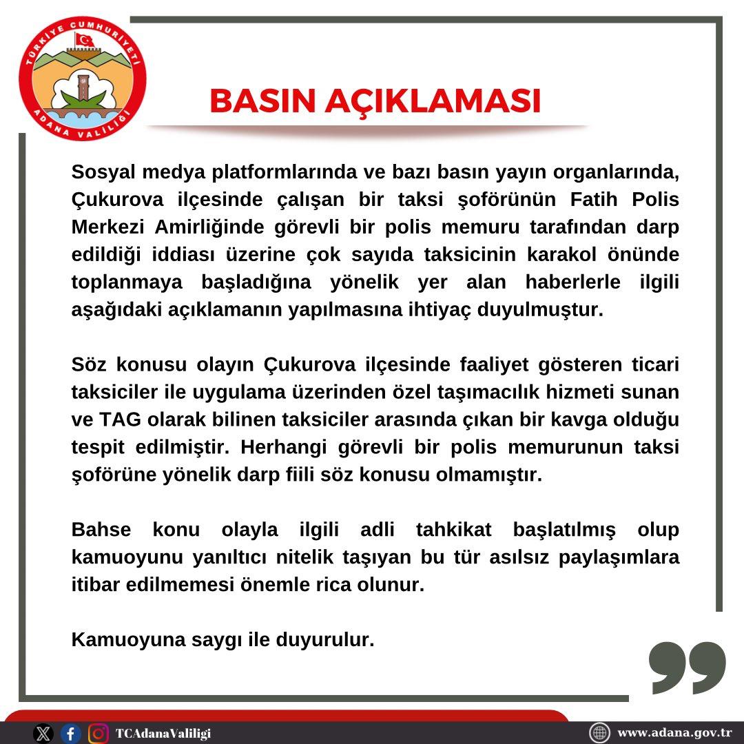 Çukurova ilçesinde, 29 Nisan Salı gecesi bir taksi şoförünün polis memuru tarafından darp edildiği iddiası sosyal medyada hareketliliğe neden olmuştu.