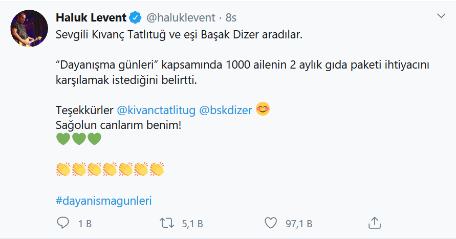 Twitter'dan Haluk Levent'in duyurusunda, oyuncu Kıvanç Tatlıtuğ ve eşi Başak Dizer, tam bin ailenin 2 aylık gıda paketini karşıladığını açıkladı.