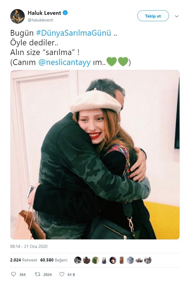 21 Ocak Dünya Sarılma Günü’nde Neslican Tay ile sarıldığı fotoğraftı Twitter hesabından paylaşan Levent, görenlere duygusal anlar yaşattı.