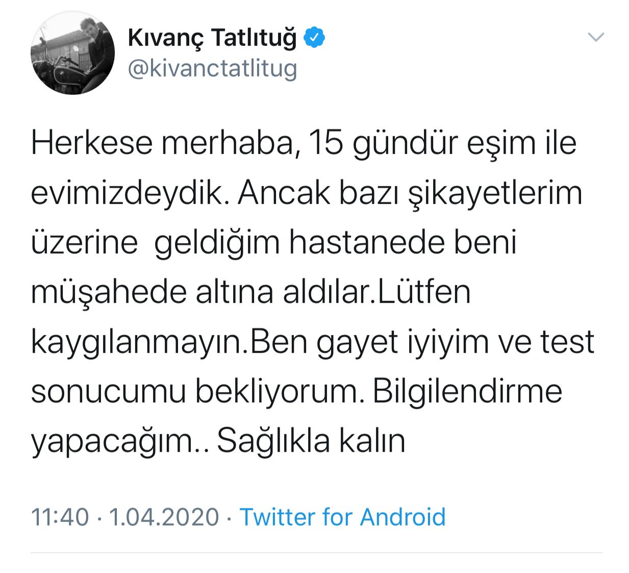 Tatlıtuğ yaptığı açıklamada, " Herkese merhaba, 15 gündür eşim ile evimizdeydik. Ancak bazı şikayetlerim üzerine geldiğim hastanede beni müşahede altına aldılar.Lütfen kaygılanmayın.Ben gayet iyiyim ve test sonucumu bekliyorum. Bilgilendirme yapacağım.. Sağlıkla kalın" dedi.