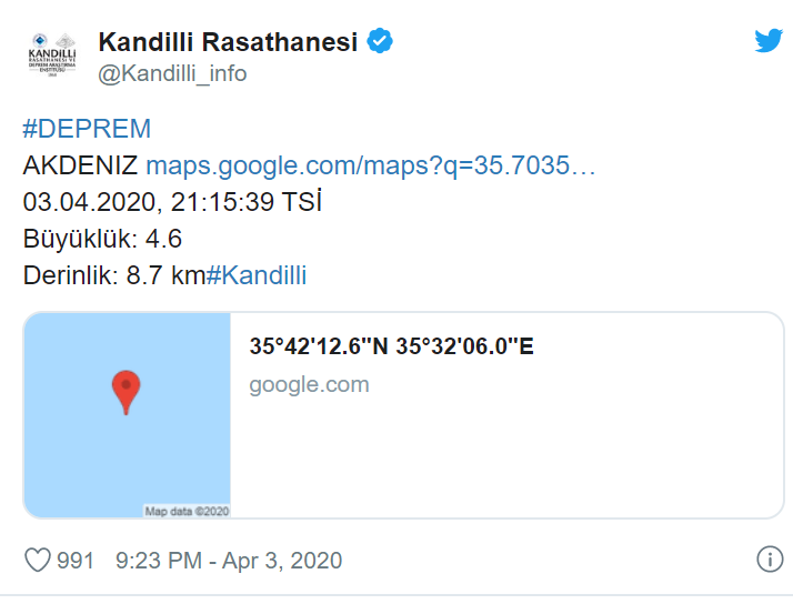 Kandilli Rasathanesi'nin Twitter hesabından ise depremin büyüklüğü 4.6 olarak duyuruldu.
