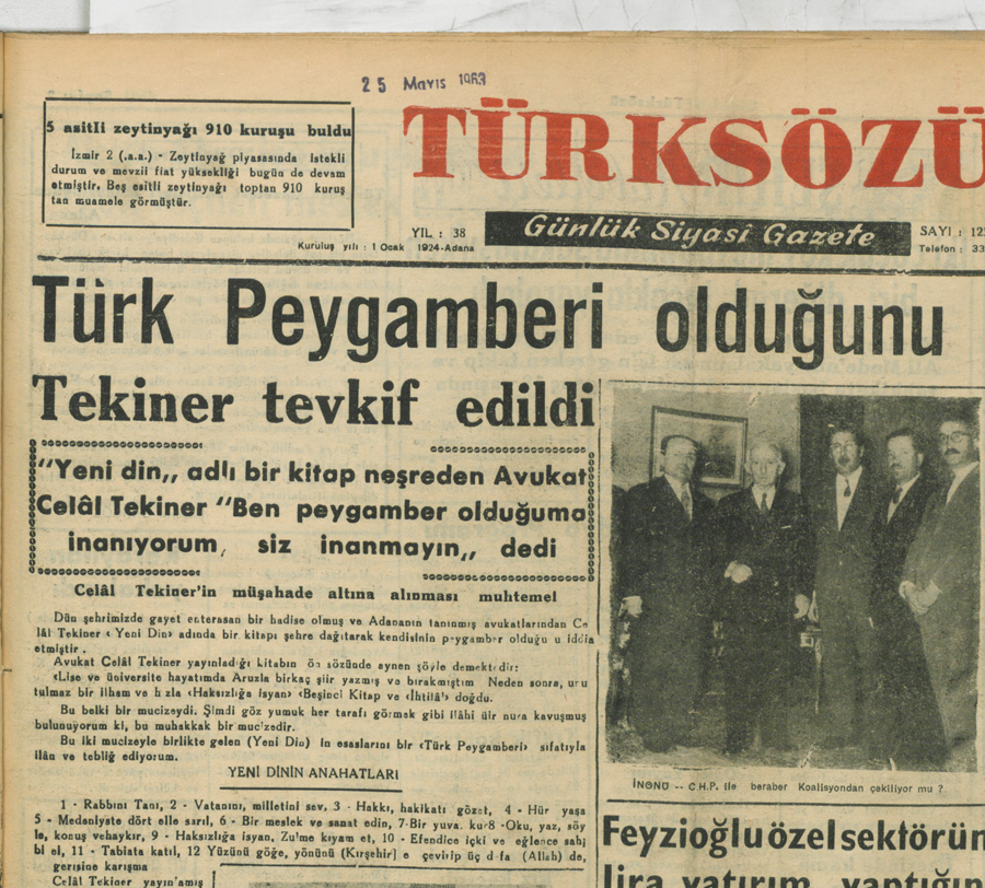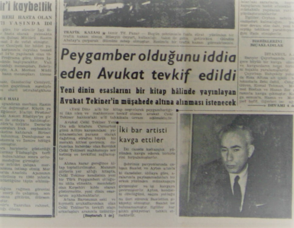 “Yeni bir din” adlı kitap neşreden Avukat Celal Tekiner “Ben peygamber olduğuma inanıyorum, siz inanmayın” dedi.