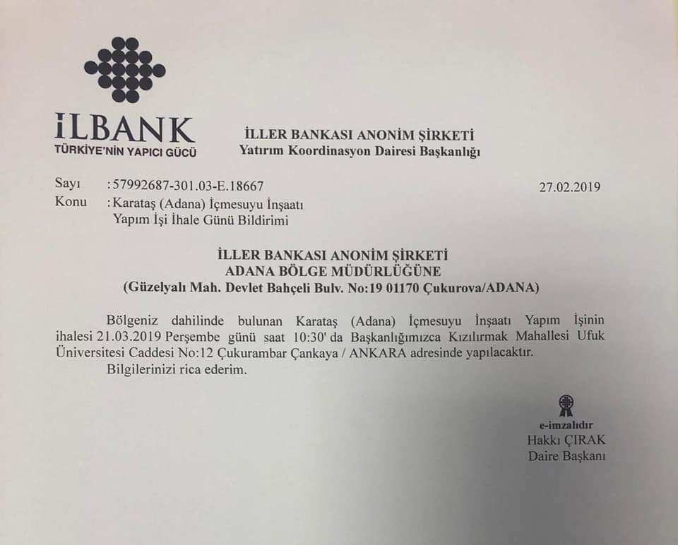 “Karataş’ımız için önemli bir proje Cumhurbaşkanımız Sayın Recep Tayyip Erdoğan himayelerinde İlbank desteğiyle gerçekleşiyor. SUKAP projesi kapsamında gerçekleştirilen; projesi tamamlanıp ihalesi 21.03.2019 tarihinde yapılan bir projedir.