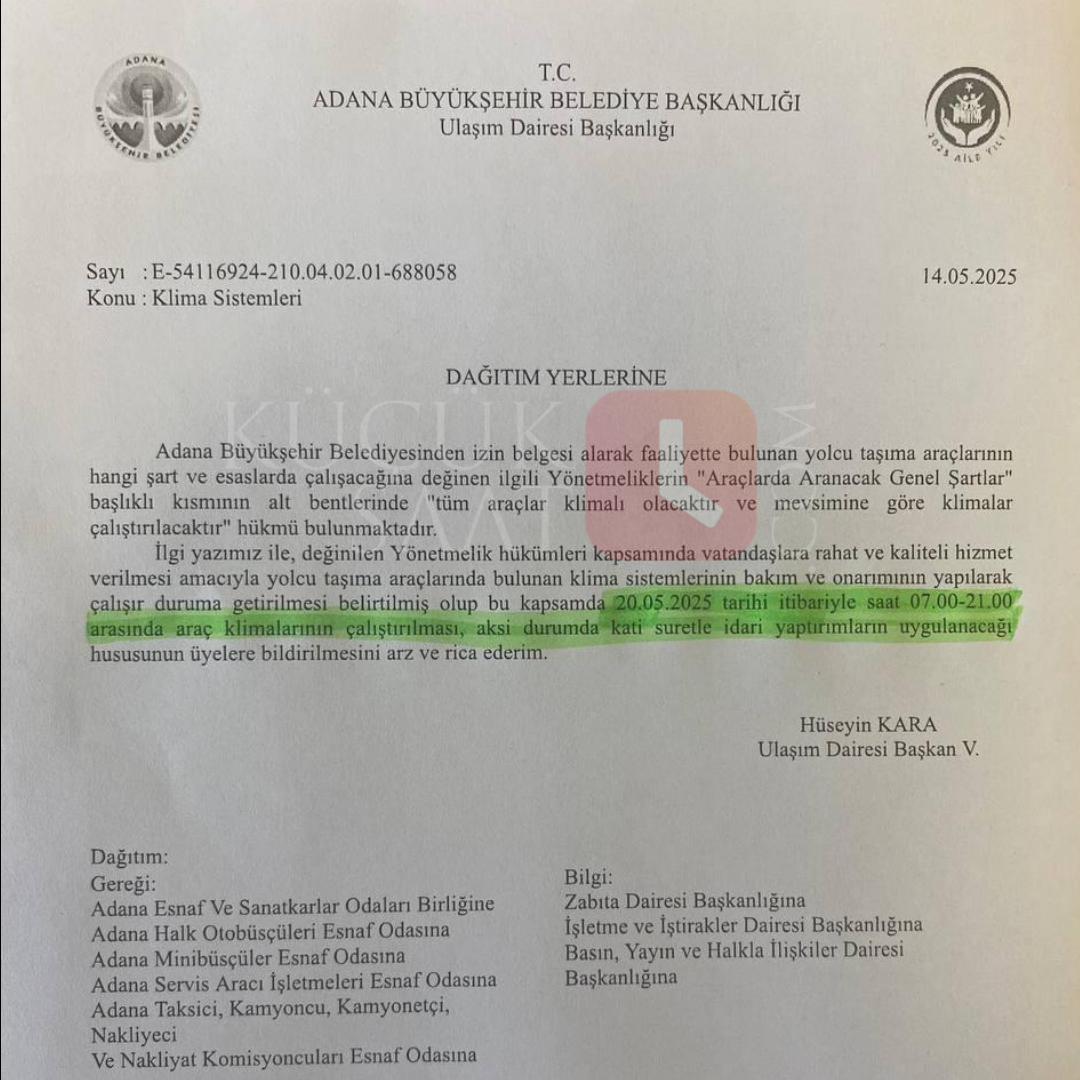 Adana Büyükşehir Belediyesi Ulaşım Daire Başkanlığı'nın açıkladığı yazıya göre 20.05.2025 tarihinden itibaren 07:00 ile 21:00 saatleri arasında klima açmak zorunlu hale gelecek.
