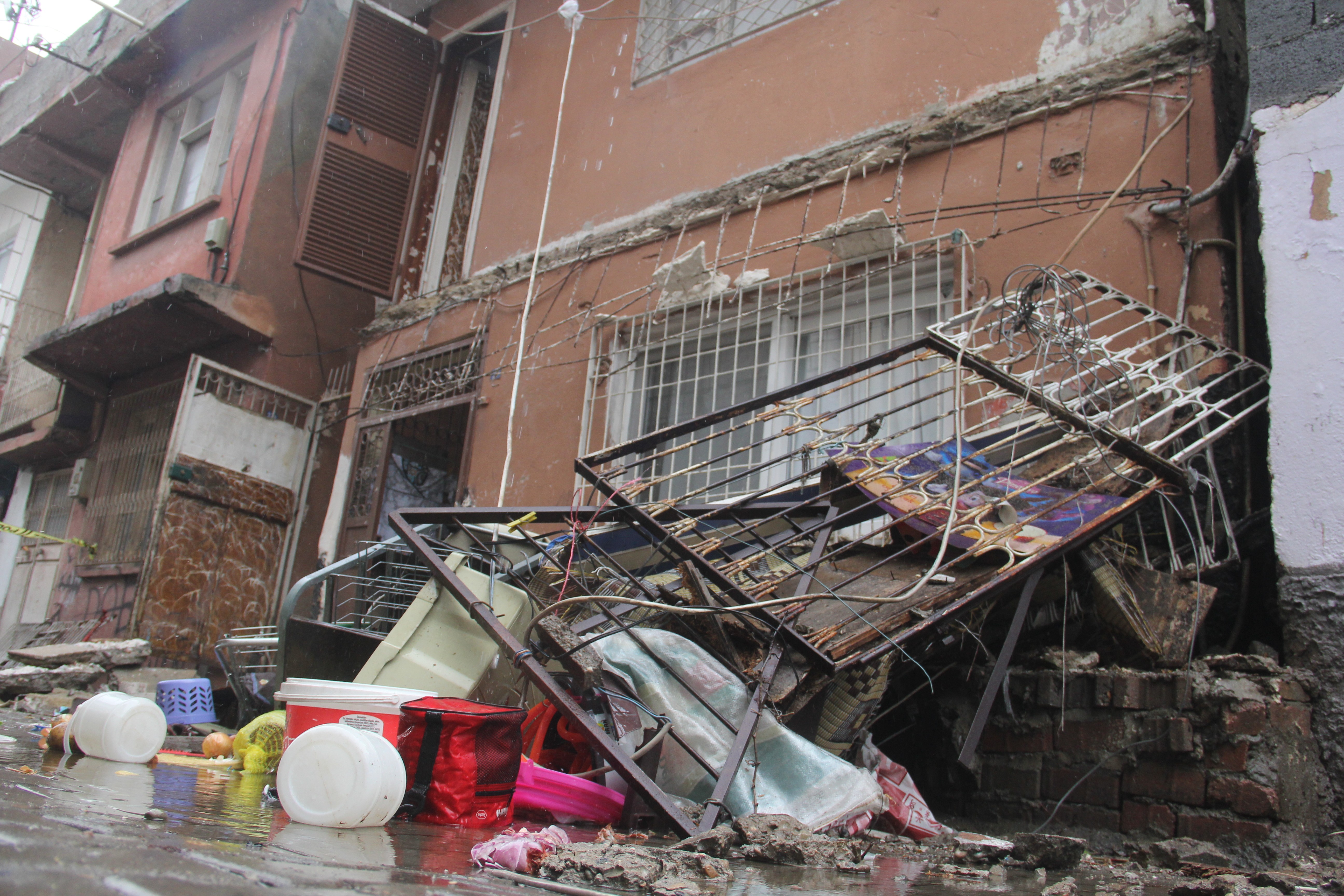 Balkonun bir haftadır devam eden yağmur nedeniyle çöktüğü öğrenildi. Olay yerine gelen polis sokağı trafiğe kapatıp güvenlik önlemi aldı.