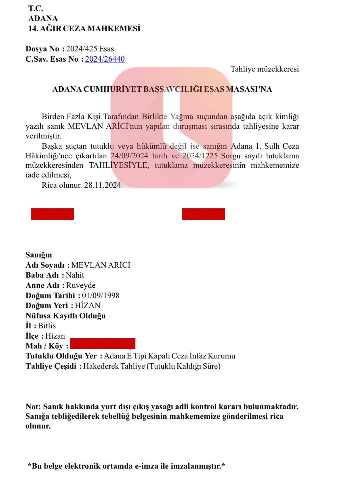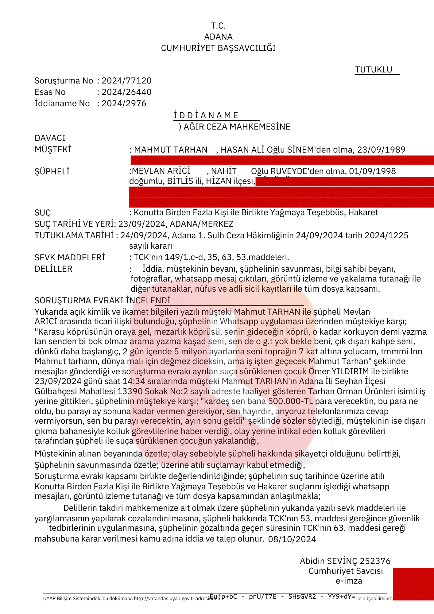 Kucuksaat.com WhatsApp ihbar hattına gelen bilgilere göre Mevlan Arici, ''Konutta Birden Fazla Kişi ile Birlikte Yağmaya Teşebbüs, Hakaret'' suçlarından 24.09.2024 tarihinde tutuklandı.