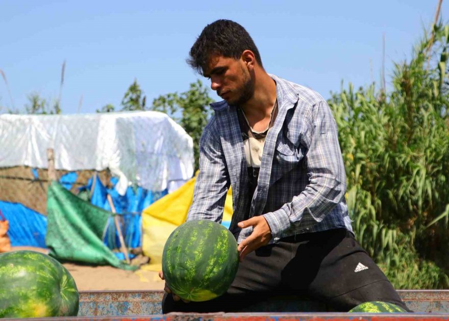 Adana'da başlayan karpuz hasadıyla birlikte "Yükleyici" olarak bilinen işçiler de 400 lira yevmiye ile yoğun mesai harcıyor günlük yaklaşık 150 ton karpuzu kamyonlara doldurarak ülkenin dört bir tarafına gönderiyor.