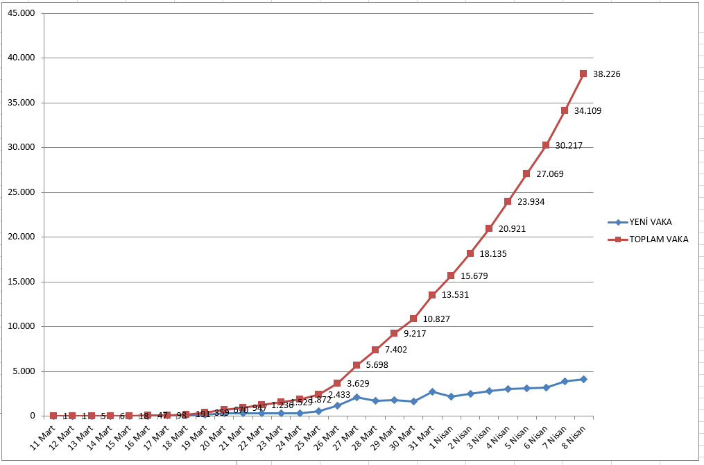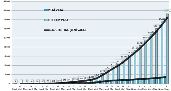 Yukarıdaki tabloda, ilk vaka görüldükten 19 Mart'a kadar sayının az olduğu, 27 Mart'tan sonra ise vakalarda ciddi bir artış olduğu görülüyor.