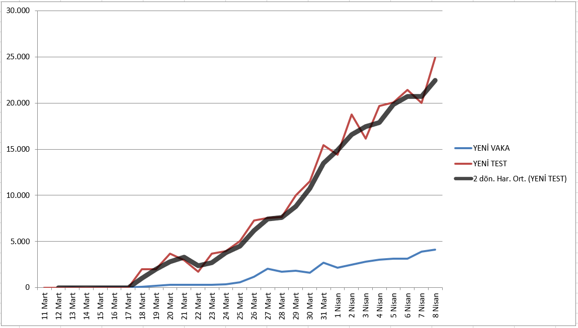 Son tabloda ise 18 Mart'a kadar düşük giden test sayısının artmasıyla birlikte yeni hasta teşhislerindeki artış dikkat çekiyor. Bu tabloda test sayısının artmasının ne kadar önemli olduğu gözler önüne seriliyor.