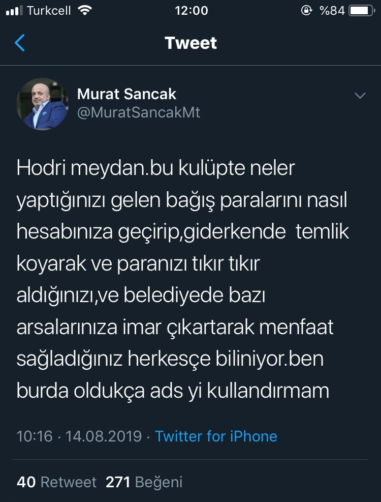 Başkan Sancak yaptığı paylaşımda, "Hodri meydan! Bu kulüpte neler yaptığınızı, gelen bağış paralarını nasıl hesabınıza geçirip giderken de temlik koyarak ve paranızı takır takır aldığınızı, belediyede bazı arsalarınıza imar çıkartarak menfaat sağladığınız herkesçe biliniyor. Ben burada oldukça ADS'yi kullandırtmam" ifadelerini kullandı.
